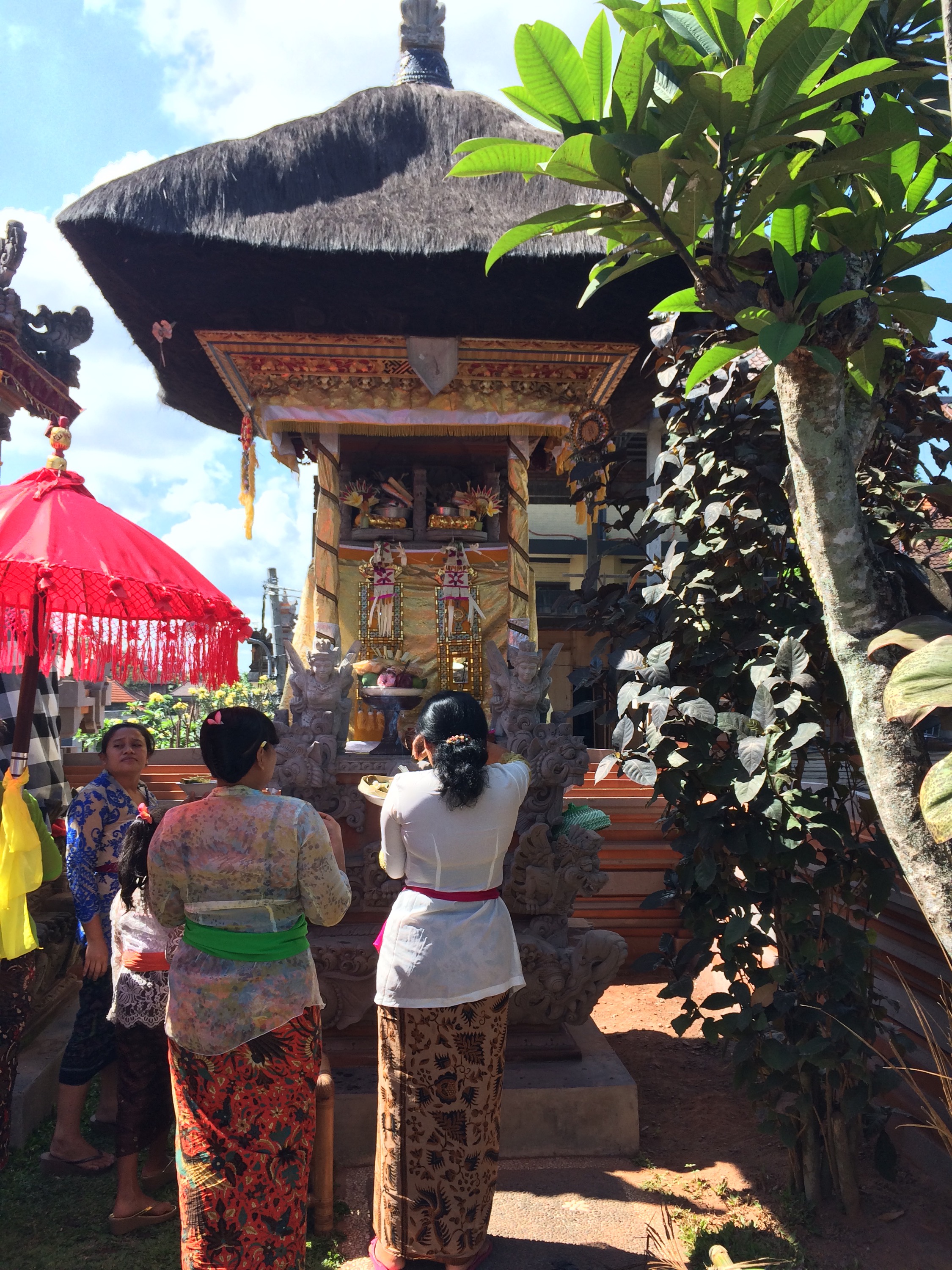 A Bali la religione hindu è quella maggiormente praticata ed è quella che da più nell’occhio. Ad ogni momento della giornata, non solo nei templi ma anche per strada, davanti ad abitazioni e negozi si trovano piccoli doni per dio e le sue diverse manifestazioni. La maggior parte delle volte sono le donne a preparare e offrire i doni. Spesso le si donne vestite in vistosi abiti tradizionali camminare con grossi cesti in testa verso il loro tempio di appartenenza.
