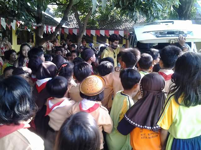 Non era la mia prima volta, qui in Indonesia di scuole ne abbiamo visitate un bel po’, al punto che durante il tragitto per arrivare alla scuola, nonostante fossi senza Giulia, mi sentivo pronto a incontrare una “massa” di energia trasmessami all’univoco da centinaia di bambini tra i sei e gli undici anni. Non appena varcata la soglia del cancello della scuola mi accorgo che avevo sbagliato a fare i calcoli. Sono stato praticamente preso d’assalto sotto il controllo inerme degli insegnanti. Quei bambini hanno fatto a gara per potermi toccare, sfiorare, dirmi il loro nome, farmi una foto e strappare addiritutra un mio autografo, manco fossi una star di Hollywood o un calciatore famoso… faccio ancora tuttora fatica a capire perché in quella scuola i bambini hanno scelto di rompere le righe, violare il registro di accoglienza, disobbedire di fronte alle regole e alla disciplina dettate dal sistema scolastico indonesiano. Magari era la prima volta per quei bambini vedere un bule (straniero di pelle bianca)… una prima volta che per me non poteva ridursi a un mero fattore numerico.