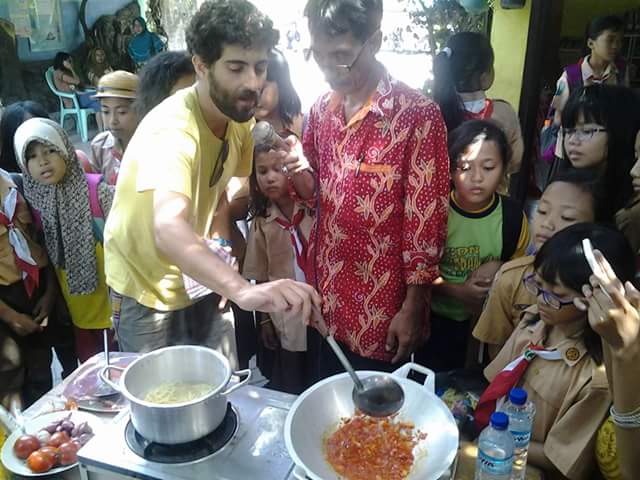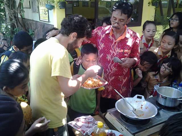 Il giorno prima, i due insegnanti della scuola ospitante (da me subito rinominati il gatto e la volpe, per il loro essere buffi) sono venuti presso la scuola SMP MU dove insegnamo inglese, per formalizzare l’invito. Non potevo lasciare passare un’altra opportunità di mediazione culturale in una semplice passerella o set fotografico. Il loro codice culturale oramai l’ho intuito e forte delle esperienze passate in altre scuole e del supporto di Pak Irin, mi faccio avanti con una proposta da loro subito recepita: “Posso insegnare a cucinare ai bambini il più famoso, il più semplice, il più efficace dei piatti italiani? Spaghetti al pomodoro!” Dopo averli informati degli ingredienti necessari, il giorno dopo la scuola elementare allestisce un mini banchetto nel cortile principale con tanto di microfono, cucinino, padella e pentola. Il resto poi è andato da se…