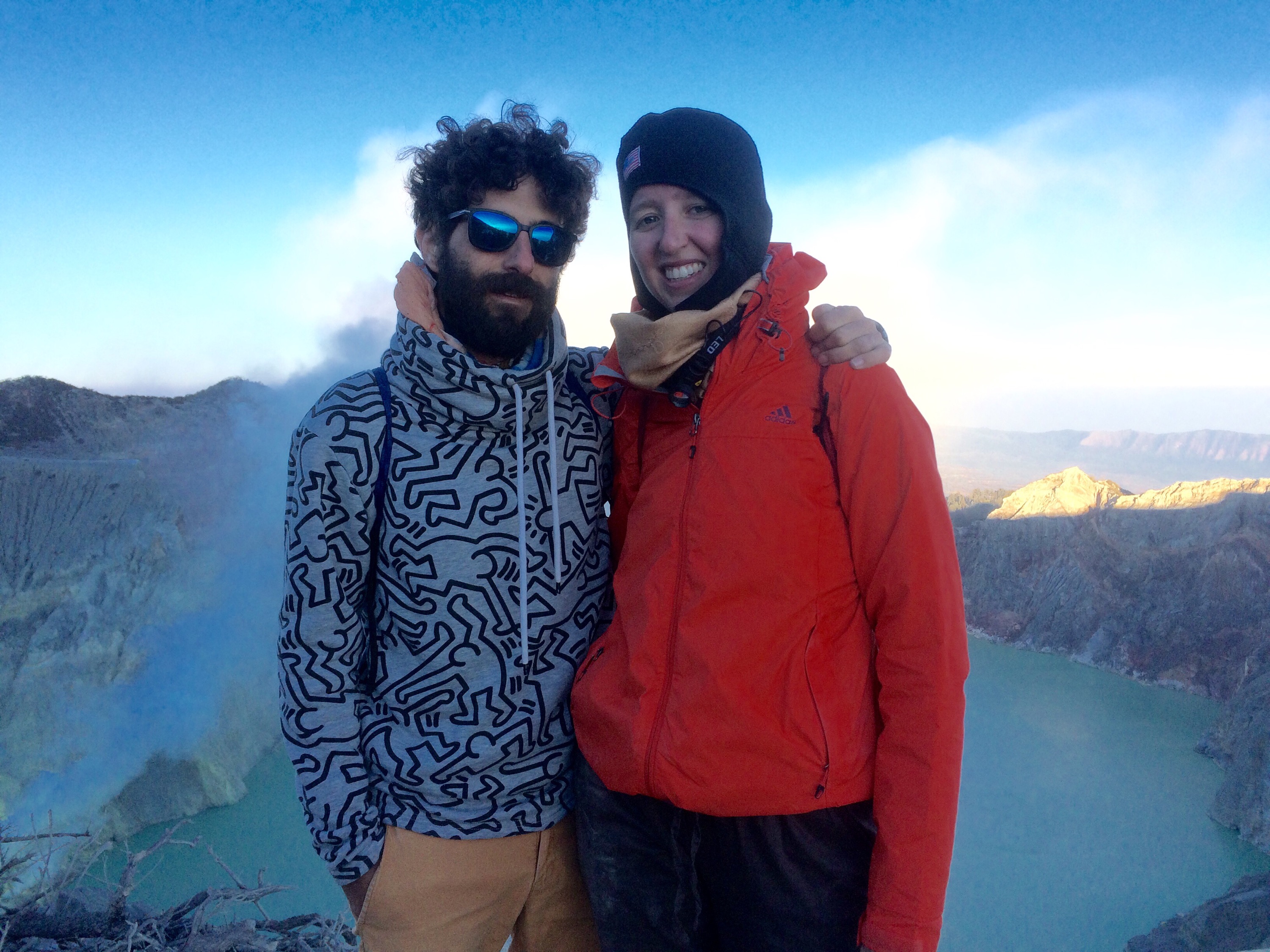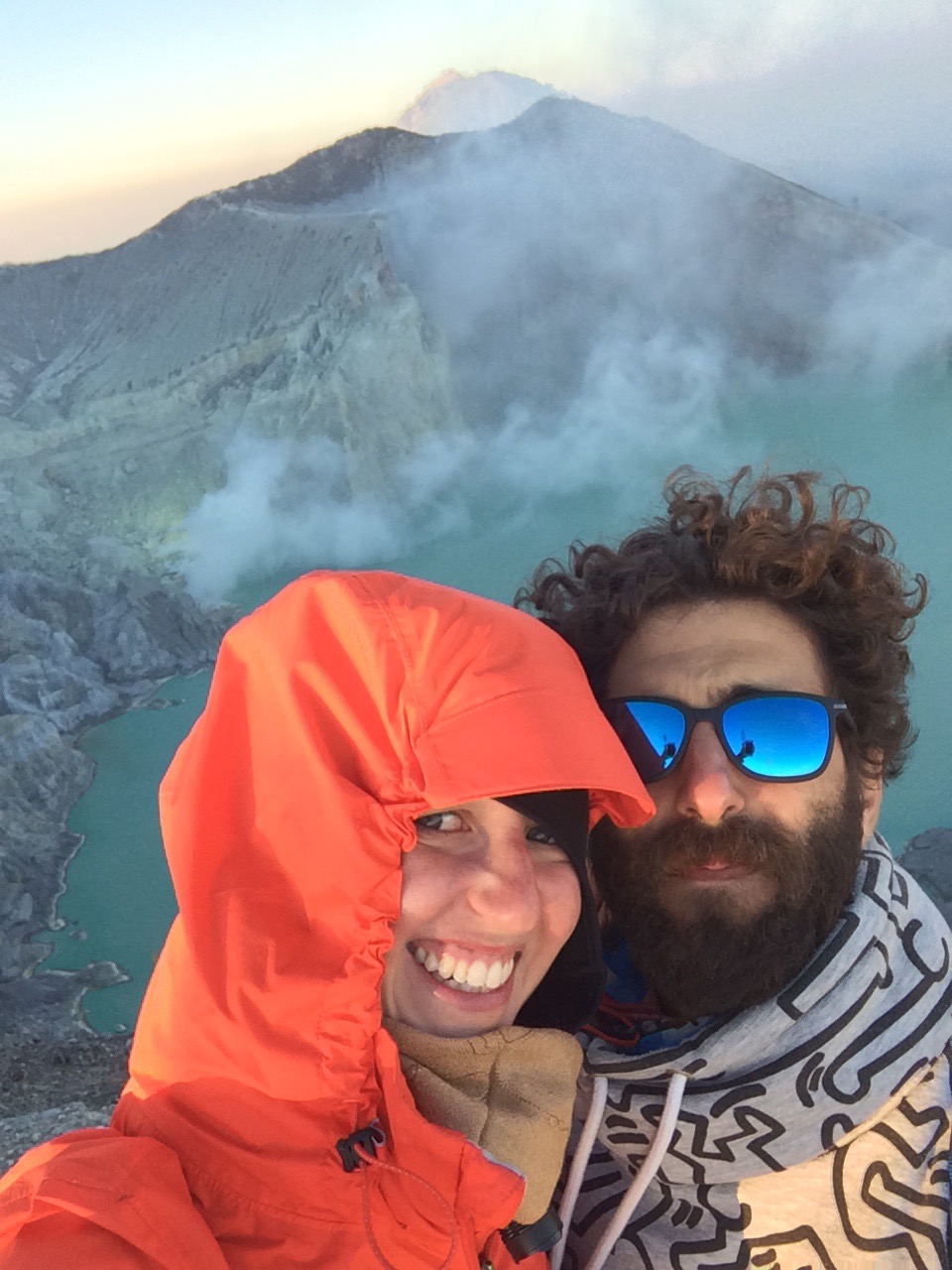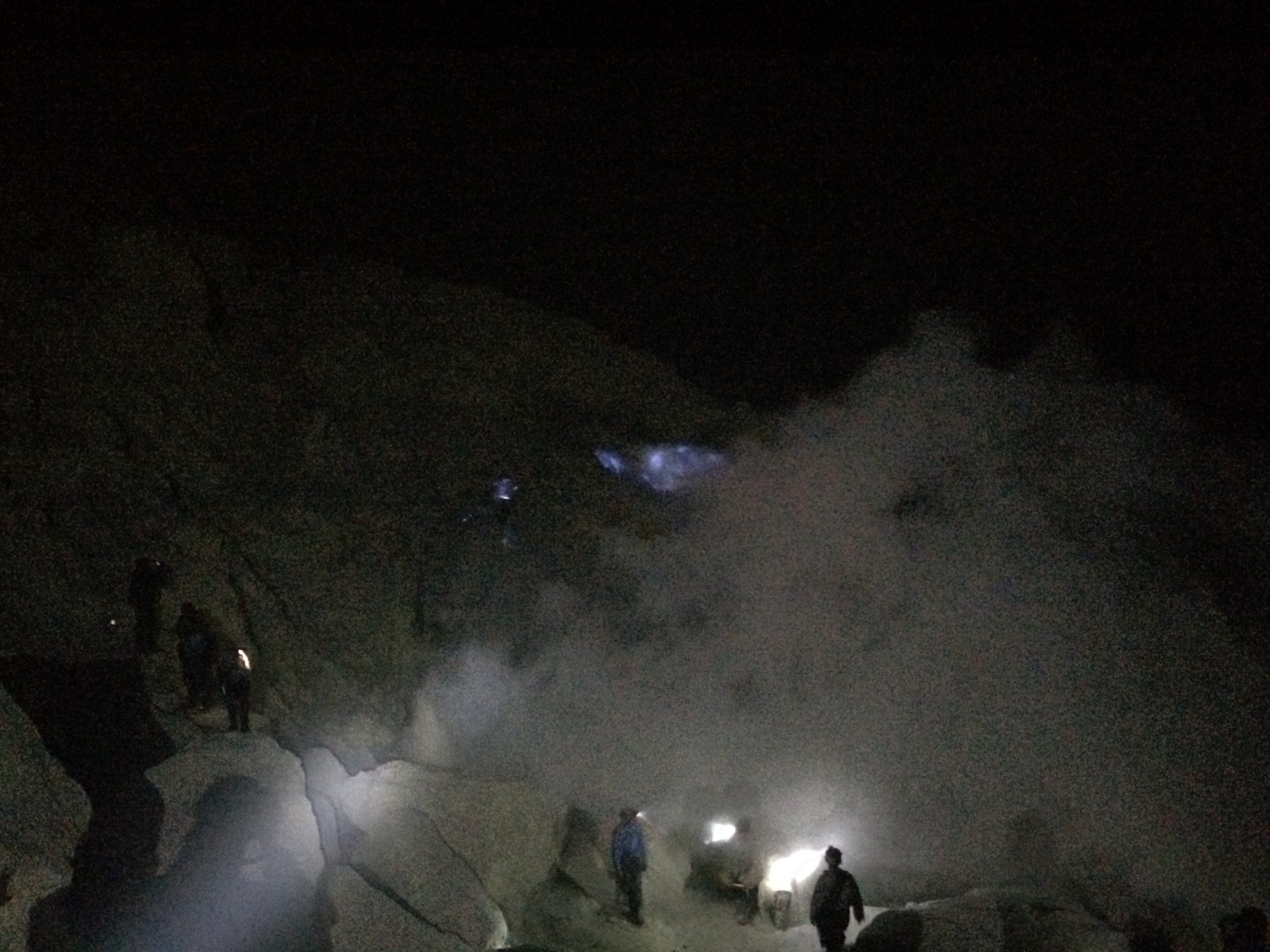 La sveglia è suonata a mezzanotte. Dopo un’ora di macchina, un caffè caldo e un acquisto all’ultimo minuto per Giulia (un cappello in pile rivelatosi una salvezza) ci siamo incamminati per raggiungere la cima del vulcano. Il nostro gruppetto di quattro era formato da un simpatico neozelandese conosciuto in treno e una guida locale. Alle 3:45 siamo arrivati in cima e dopo aver indossato le maschere antigas, ci siamo inoltrati nella ripida discesa rocciosa del cratere. Ci siamo abituati malvolentieri all’odore acre di zolfo che si è intensificato fino a diventare insopportabile quando siamo arrivati ai piedi del lago del cratere. Due grandi tubi di metallo sparano incessantemente in aria il gas sulfureo naturale estratto dalla sorgente, che a contatto con il lago acido del cratere crea una fiamma blu alta fino a 5m. La fiamma è visibile solo di notte, motivo del pellegrinaggio a ore indecenti..