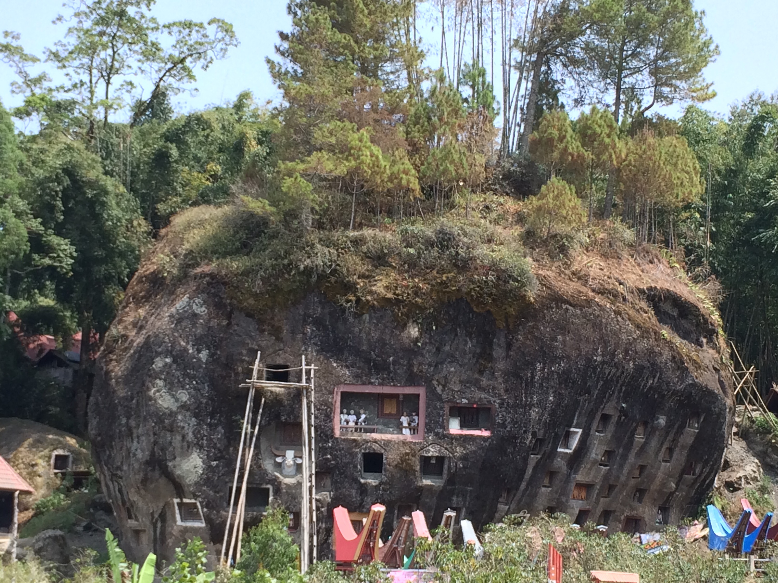 Le cerimonie funebri vengono celebrate con gioia e serenità da parte delle famiglie, oltre alla giornata dedicata alla mattanza dei bufali, le diverse funebri si protraggono per vari giorni e sono molto diverse fra di loro. Nel nostro caso, il giorno dopo la mattanza la famiglia si è riunita nuovamente per una breve messa e per seppellire la bara in un cunicolo scavato da gente specializzata nelle rocce, in modo da evitare atti di scialaggio (i toraja seppelliscono i morti con oggetti di valore e gioielli).